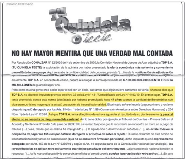 La empresa TDP que explota la quiniela en el país asumió que no pagó el canon correspondiente a los veteranos del Chaco. Además, dejó en claro que ya no lo hará.