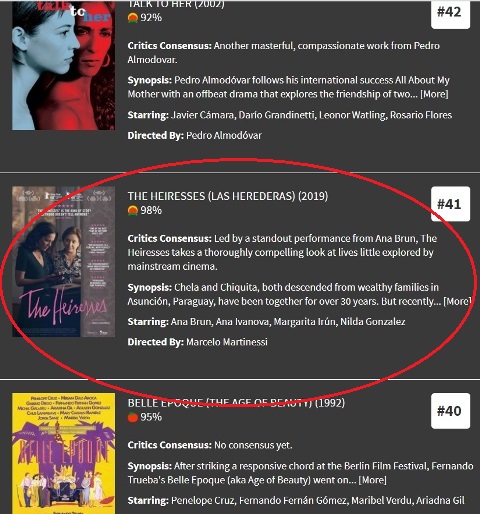 La película paraguaya Las Herederas, de Marcelo Martinessi, ocupa el puesto 41. “Liderado por una actuación destacada de Ana Brun, Las Herederas, ofrece una mirada completamente convincente a vidas poco exploradas por el cine convencional”, expone el informe.
