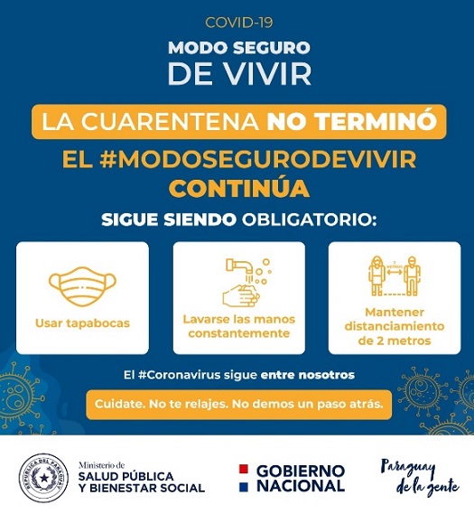 “Dispónese que las actividades del sector cultural y creativo, y sus respectivos ensayos, prácticas y actividades de enseñanza, podrán ser realizadas con un aforo máximo de 50 personas establecido a partir del distanciamiento físico preventivo de 2 metros entre espectadores y en estricta observancia de los protocolos establecidos para cada disciplina y actividad por la Secretaría Nacional de Cultura, y aprobados por el Ministerio de Salud Pública y Bienestar Social”, menciona sobre el sector cultura.