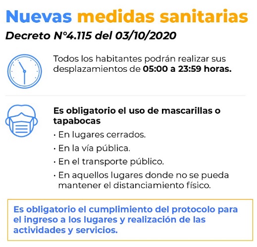 Según el escrito, las nuevas disposiciones regirán desde el lunes 5 hasta el domingo 25 de octubre. Antes de conocerse el documento, desde el Ministerio de Salud emitieron un comunicado en el cual aclaran que la cuarentena continúa y que no hay una libertad total para toda actividad.