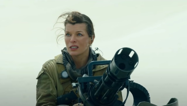 Pero el estreno del primer avance, que muestra a la protagonista Milla Jojovich, lidiando con un gigantesco monstruo en un desierto junto a un grupo de soldados, da una info más precisa. Anuncia; “Sólo en cines; diciembre”