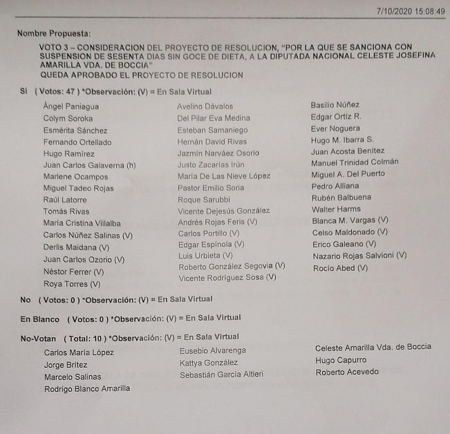 La diputada fue sancionada con la suspensión por una supuesta inconducta. La cuestión fue consumada gracias a 47 votos, de colorados y liberales.