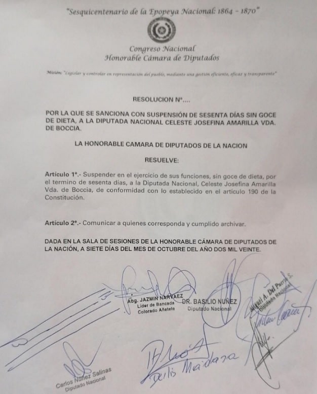 En este sentido se puede decir que dos procesados por la justicia tuvieron “autoridad moral” para sancionar a la colega, se trata de Tomás Ever Rivas, diputado colorado por Paraguarí, y Carlos Portillo, diputado liberal del Alto Paraná.