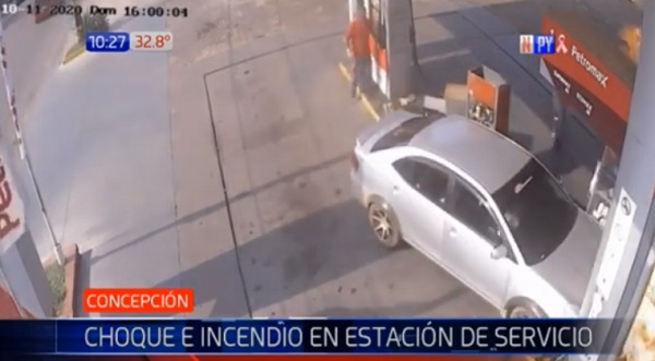 Según las imágenes del circuito cerrado, se puede ver cómo el vehículo ingresa al lugar y choca contra los puestos de carga de combustible y provoca un incendio.