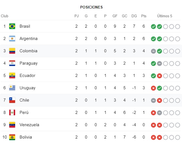 Tras las dos primeras fechas disputadas, Brasil y Argentina están primeros con 6 puntos, sin embargo la Verdeamarela saca ventaja en goles anotados.