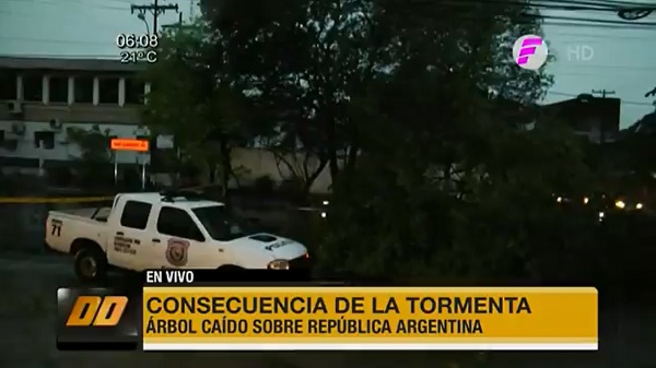 Así ocurrió sobre la avenida República Argentina, donde un gran árbol cayó al pavimento, frente mismo al Colegio Nacional Stella Maris, y bloqueó la calzada de ingreso hacia la terminal de ómnibus.