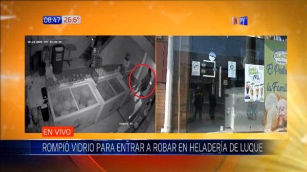 Cámaras de circuito cerrado captaron el momento en que un limpiavidrios ingresó a una heladería en Luque para llevarse la caja registradora del lugar.