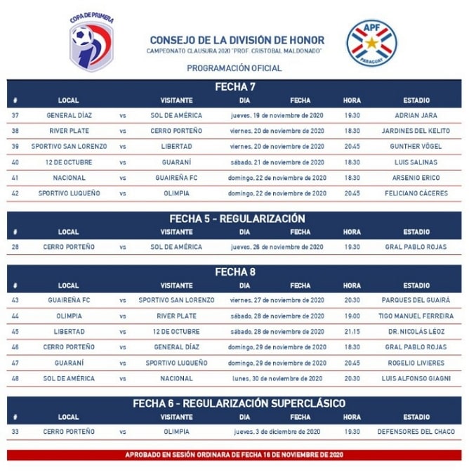 El Consejo de la División de Honor de la Asociación Paraguaya de Fútbol fijó el calendario de las fechas 7 y 8, como así también la reprogramación de dos compromisos correspondientes a las jornadas 5 y 6 del Torneo Clausura, informó la APF.