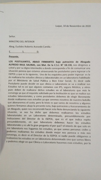 “Hay postulantes que tienen seguros de IPS, a través de sus padres o seguros privados. Sin embargo, la denuncia que nosotros estamos haciendo es que el director de la institución y algunos comisarios salieron afuera de la institución, donde dice que la Isepol va a designar a los postulantes en qué laboratorio se va a hacer su estudio, y eso es lo que para nosotros presumiblemente está mal y eso es lo que nosotros denunciamos ante el Ministerio del Interior para que investigue un poco cuál es el interés de las autoridades de la Isepol para que ellos digan en qué laboratorio se tienen que hacer”, detalló.