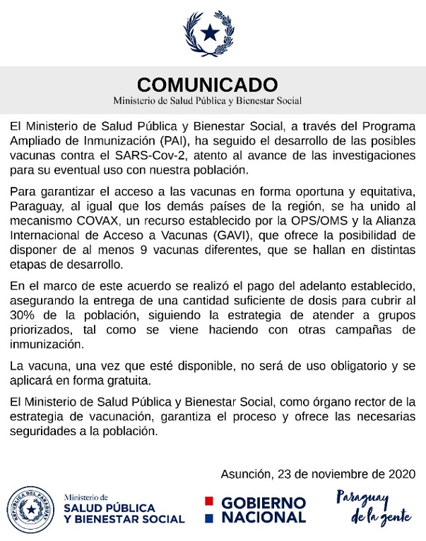 De acuerdo a lo mencionado semanas atrás por el Dr. Guillermo Sequera, director de Vigilancia de la Salud, se espera que Paraguay tenga una de las vacunas en desarrollo antes del invierno de 2021.