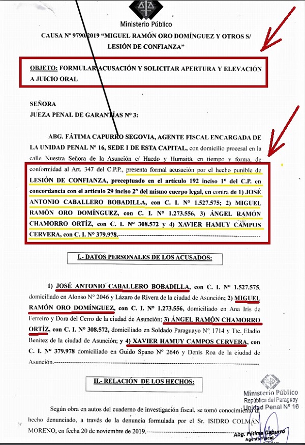 El Ministerio Público formuló acusación contra los cuatro administradores de la Caja Bancaria por lesión de confianza, además, pidió la elevación de la causa a juicio oral y público.