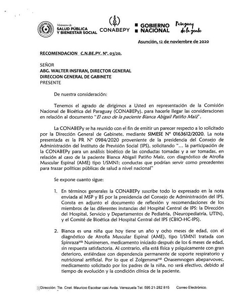 De acuerdo a lo informado por La Nación, el documento fue remitido por la Comisión Nacional de Bioética del Paraguay (Conabepy), firmado por la doctora Imelda Martínez Núñez, presidenta de la institución, y su colega Margarita Villafañe, secretaria.