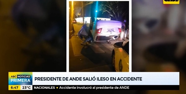 El presidente de la Administración Nacional de Electricidad, Félix Eladio Sosa, resultó ileso de un accidente de tránsito, donde iba de acompañante en un vehículo que tumbó tras un choque en un cruce semafórico.