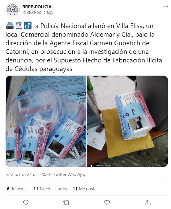 La Policía Nacional informó sobre un inusual allanamiento, en el cual fueron incautadas cédulas de identidad paraguaya, no de personas, sino de animales.