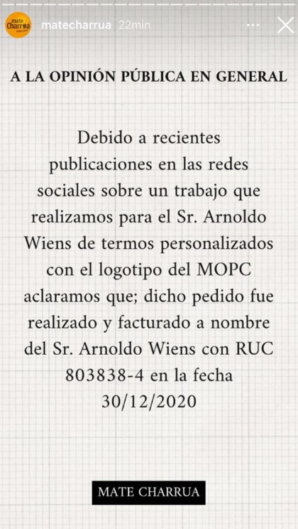 Mate Charrúa, la firma proveedora, publicó un escrito en el cual asegura que fue Wiens quien adquirió los termos.