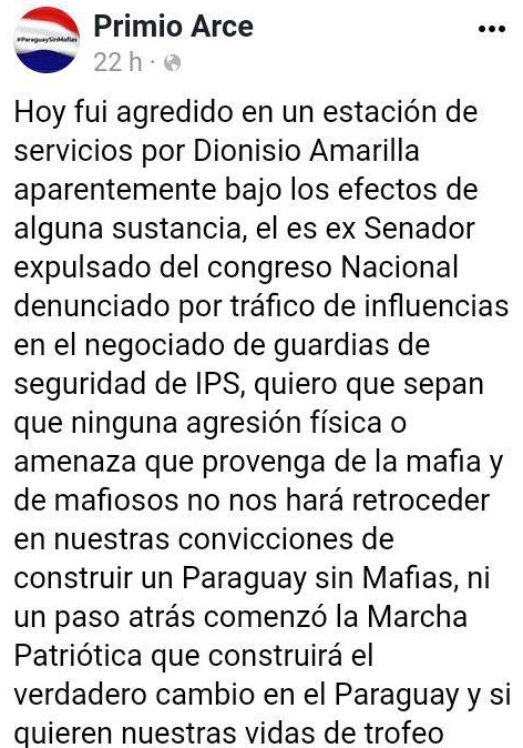 Desde su cuenta en redes sociales, así como en varios grupos de WhatsApp, el jefe de prensa del PLRA y seguidor de Efraín Alegre, Primio Arce, denunció al exsenador, Dionisio Amarilla, por una agresión.