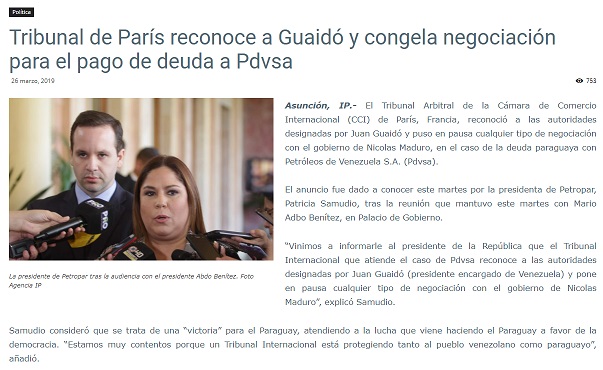 Comentó a Radio ABC Cardinal que cuestionaron la respuesta, porque el 26 de marzo de 2019, IP publicó una noticia “positiva” en la cual afirmó que la expresidenta de Petropar, Patricia Samudio, dijo al Presidente Mario Abdo Benítez que Paraguay obtuvo que el Tribunal Arbitral reconozca la personería jurídica de Guaidó y relegue la de Nicolás Maduro.