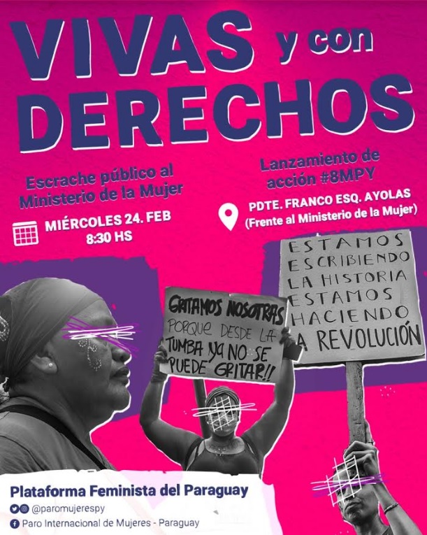 “Nuestra acción de homenaje a compañeras y de escrache a Mario Abdo Benítez y Ministra de la Mujer será el miércoles 24 de febrero a las 8.30 horas frente al Ministerio de la Mujer, ubicado en Presidente Franco y Ayolas”, detallaron en la misiva.