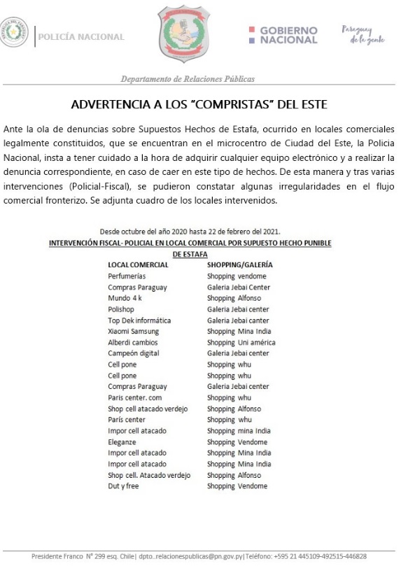 Según el escrito, la institución recibió una importante cantidad de denuncias por supuestos hechos de estafa, ocurridos en establecimientos comerciales de Ciudad del Este.