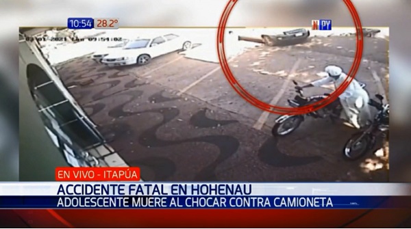 Imágenes de circuito cerrado muestran el momento en que un adolescente, de 16 años, choca contra una camioneta que salía del estacionamiento de un local gastronómico.