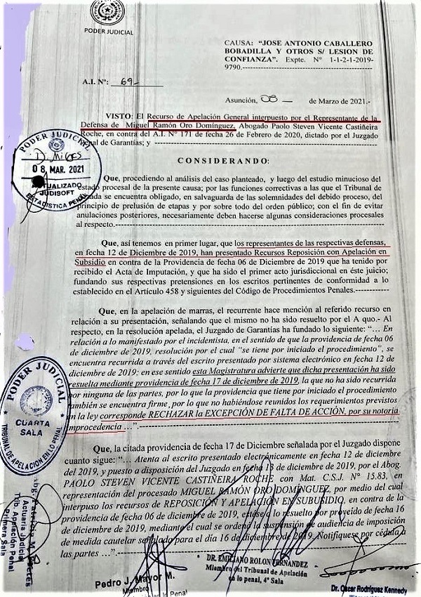 El Tribunal de Apelaciones Cuarta Sala admitió los recursos de apelación presentados por las defensas técnicas de los cuatro acusados por lesión de confianza por más de G. 2 billones de la Caja Bancaria.