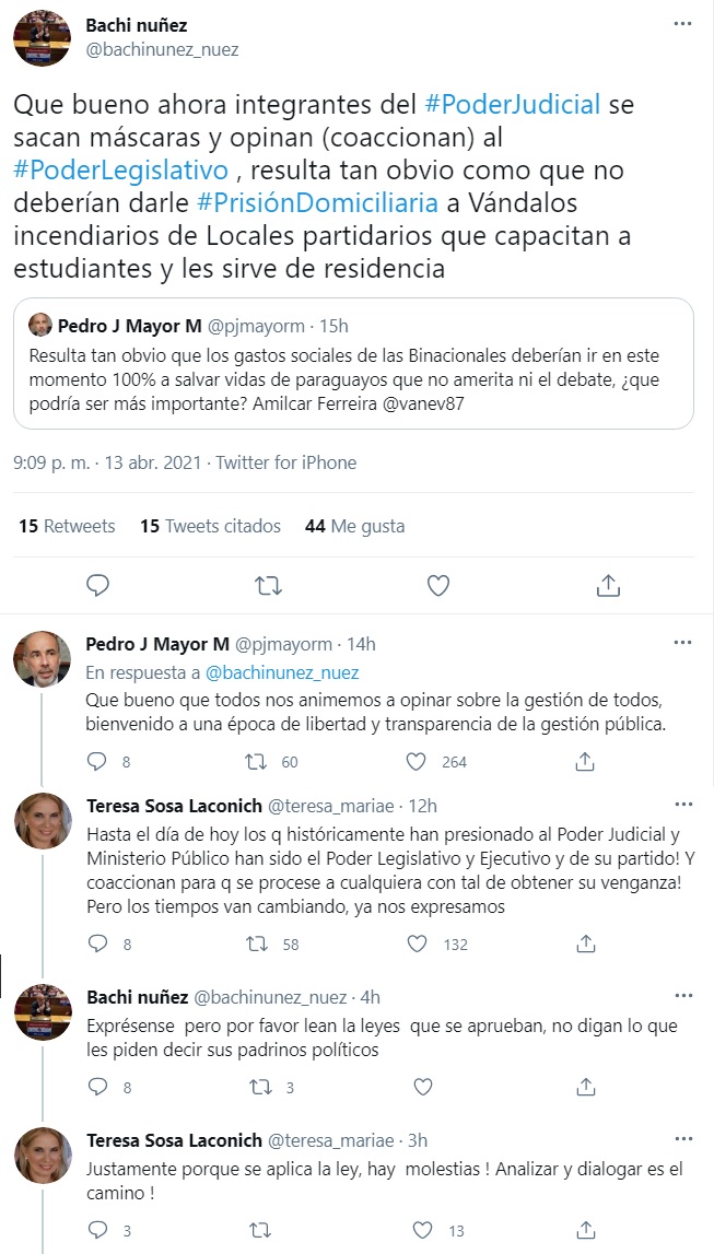 “Que bueno ahora integrantes del Poder Judicial se sacan máscaras y opinan (coaccionan) al Poder Legislativo , resulta tan obvio como que no deberían darle Prisión Domiciliaria a Vándalos incendiarios de Locales partidarios que capacitan a estudiantes y les sirve de residencia (sic)”, manifestó el legislador sosteniendo la postura de su bancada.