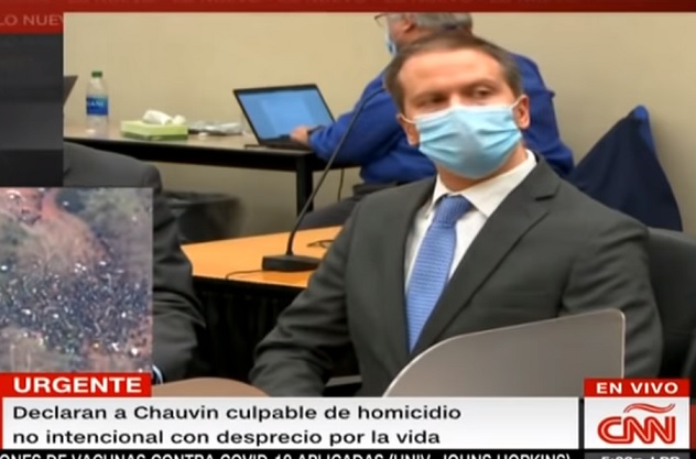 Durante la lectura del veredicto, el rostro de Chauvin fue visto a medias debido a la mascarilla por el Covid-19 que le cubría la cara. Se pudo ver poco de su reacción, más allá de sus ojos, que se movían rápidamente por la sala del tribunal.