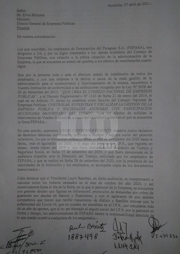 “El personal de la empresa se encuentra con grandes deudas en bancos y financieras; y con el agravante de que existen compañeros que tienen que recibir tratamiento de diálisis y familias enteras con la enfermedad del Covid-19, que no pueden ser atendidas en el IPS, por adeudarse más de un año de aportes, que al no ser abonado el seguro social del IPS por la patronal en forma y tiempo, los administradores de FEPASA tiene la responsabilidad absoluta de lo que pueda ocurrir a cualquier de los asegurados”, dice el último fragmento de la nota enviada.