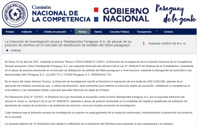 A través del Informe Técnico CONACOM/DI N° 2/2021, la Dirección de Investigación de la Comisión Nacional de la Competencia formuló acusación contra Teledeportes Paraguay S.A. por supuesta infracción del artículo 9 de la Ley N° 4956/2013 de Defensa de la Competencia.