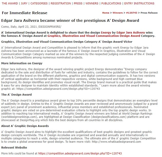 “Fue durante las publicaciones en estos foros y sitios internacionales de diseño que recibo la invitación, mencionando que he llamado la atención de ellos sobre mi trabajo publicado de Energy, y haciendo extensa la invitación a través una nominación a inscribir mi trabajo al galardón”, explicó seguidamente.