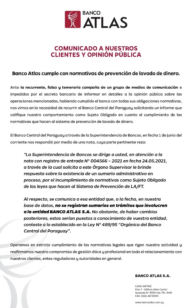 “Ante la recurrente, falsa y temeraria campaña de un grupo de medios de comunicación e impedidos por el secreto bancario de informar en detalles a la opinión pública sobre las operaciones mencionadas, habiendo cumplido el banco con todas sus obligaciones normativas, nos vimos en la necesidad de recurrir al Banco Central del Paraguay solicitando un informe que califique nuestro comportamiento como Sujeto obligado en cuanto al cumplimiento de las normativas que hacen al sistema de prevención de lavado de dinero”, indica parte del escrito.