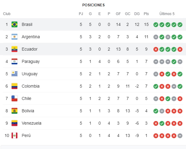 El cuadro verdeamarelo suma 15 puntos, fruto de cinco victorias y es el único puntero. Por su parte, Ecuador se mantiene con 9 unidades.