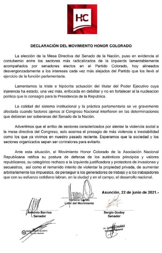 “La elección de Mesa Directiva del Senado de la Nación, puso en evidencia el contubernio entre los sectores más radicalizados de la izquierda lamentablemente acompañados por senadores electos en el Partido Colorado, hoy alineados desvergonzadamente a los intereses cada vez más alejados del Partido que los llevó al ejercicio de la función parlamentaria”, comienza señalando el escrito.