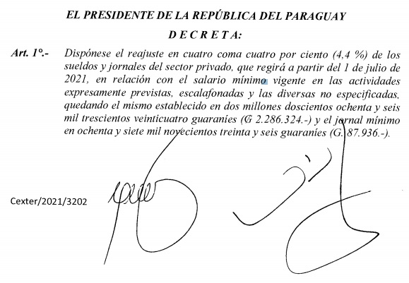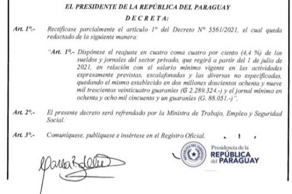 Pasadas las 21:30 de este viernes, el Ejecutivo publicó un nuevo decreto, el 5562, por el cual enmienda el anterior y deja el salario mínimo en G. 2.289.324, mientras que el jornal mínimo queda fijado en G. 88.051. El reajuste corre desde julio.
