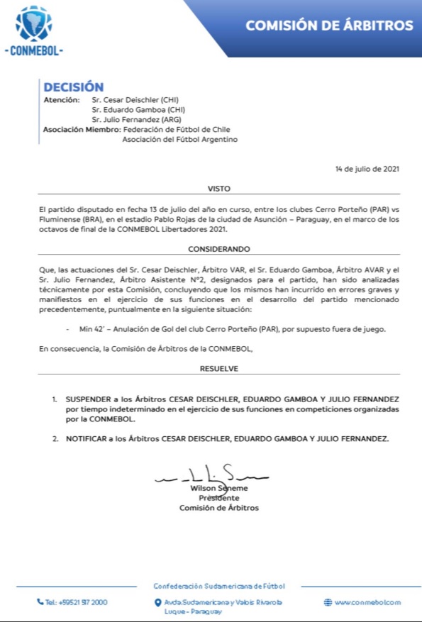 En el considerando de la resolución se menciona lo siguiente: “Que las actuaciones de Sr. Cesar Deischler, Árbitro VAR, el Sr. Eduardo Gamboa, Árbitro AVAR y el Sr. Julio Fernandez, Árbitro Asistente Nº 2, designados para el partido, han sido analizadas técnicamente por esta Comisión, concluyendo que los mismos han incurrido en errores graves y manifiestos en el ejercicio de sus funciones en el desarrollo del partido mencionado procedentemente, puntualmente en la siguiente situación”. A continuación, se cita la jugada en cuestión.
