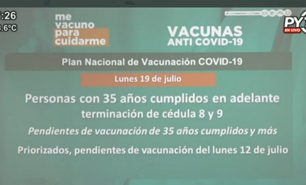 Para el lunes 19 serán inmunizados los mayores de 35 años, con terminación de cédula 8 y 9, además de los esenciales que no recibieron la dosis el pasado lunes.