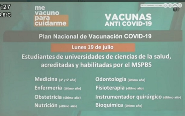 También el lunes serán inmunizados estudiantes de Medicina (cuarto y quinto año) y carreras afines, como nutrición, odontología, enfermería, entre otras (que cursan el último año). Además se incorporarán otros trabajadores esenciales como funcionarios de justicia, de Migraciones, Registros Públicos, entre otros.