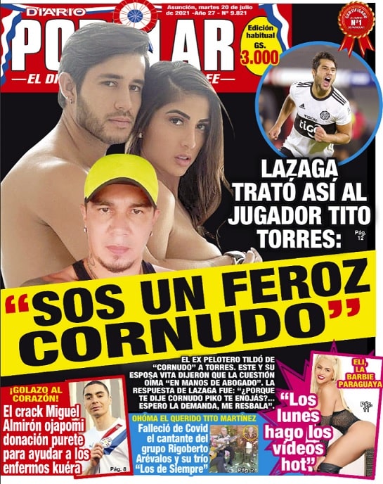 En su tapa, el medio indica “Sos un feroz cornudo”, con las imágenes de Lazaga, Torres y Cristina Aranda, esposa del jugador del Decano. Agrega que la cuestión ya se encuentra en manos del abogado de la pareja.