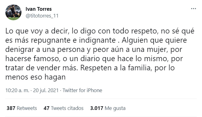 Siguiendo con la cuestión, Torres dio a conocer sus sensaciones en su cuenta en Twitter, donde exteriorizó su parecer. “Lo que voy a decir, lo digo con todo respeto, no sé qué es más repugnante e indignante. Alguien que quiere denigrar a una persona y peor aún a una mujer, por hacerse famoso, o un diario que hace lo mismo, por tratar de vender más. Respeten a la familia, por lo menos eso hagan”, lanzó.