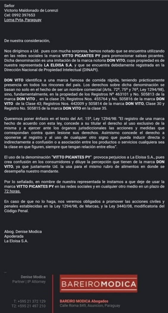 “Por lo señalado, en nombre de nuestra representa le instamos a que deje de usar la marca VITTO PICANTES PY en las redes sociales y en cualquier medio en el plazo de 72 horas”, agrega el texto.