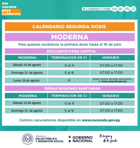 La vacuna Moderna no será aplicada este viernes, en la capital, pero sí los días, sábado, domingo y lunes, según terminación de cédula.