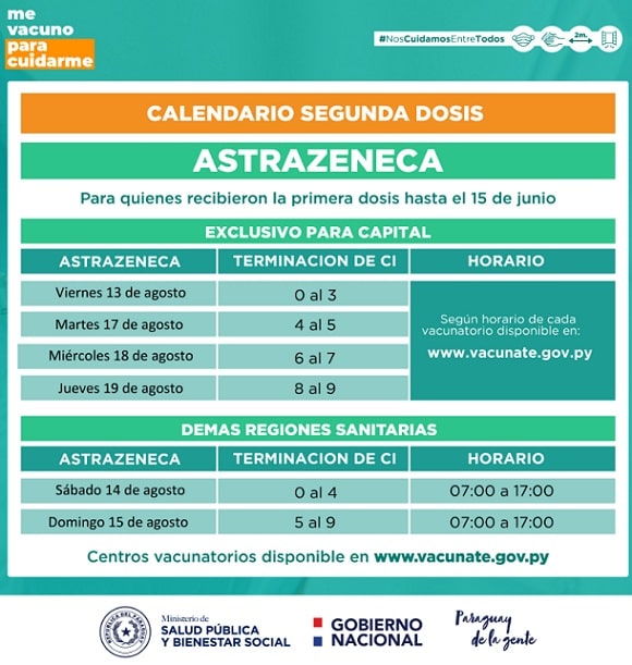 Este viernes 13 de agosto, arranca la aplicación de segundas dosis de la vacuna AstraZeneca, luego los días martes, miércoles y jueves de la semana entrante, en capital. Mientras que para las regiones sanitarias habrá otro calendario.