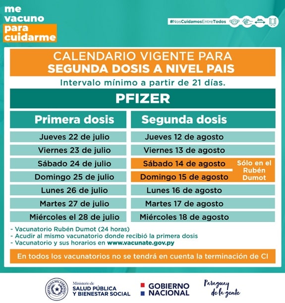 Con respecto a las dosis de Pfizer, estás se siguen aplicando con un intervalo de 21 días. Pero durante este fin de semana (sábado y domingo), solo se hará la aplicación de este biológico en el autódromo Rubén Dumot, que funciona las 24 horas.