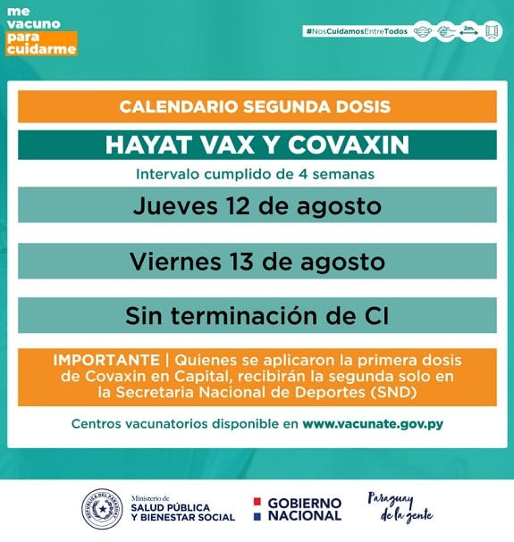 La aplicación de segundas dosis de Hayat Vax y Covaxin, se hará este jueves 12 y viernes 13, sin necesidad de terminación de número de cédula.