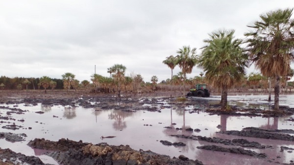 Según los funcionarios del Ministerio del Ambiente y Desarrollo Sostenible (MADES), durante la intervención se constató la acumulación de un extraño líquido de tono rosa en una superficie de dos hectáreas y media aproximadamente, contenido mediante taludes o diques con una altura de alrededor de un metro.