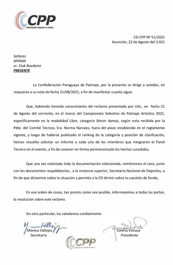 Por su parte, la Confederación Paraguaya de Patinaje, alegó que el pedido fue presentado de manera tardía, pues fue luego de la publicación del ranking de la categoría y posición de la clasificación.