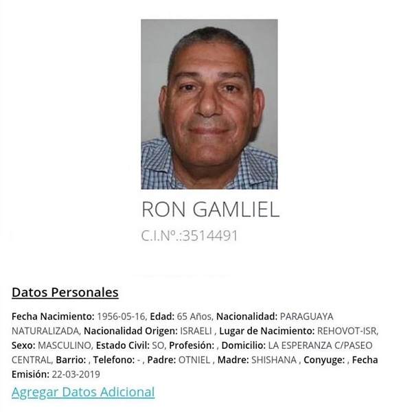 Se trata del empresario naturalizado paraguayo Ron Gamliel, quien según su cedula paraguaya tiene 65 años de edad, quien tenía orden de captura y pedido de extradición por parte de Israel, informó ABC Color.