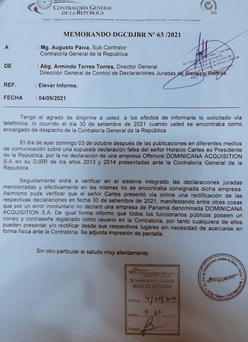 Se dio a conocer una nota memorando en la que el abogado Armindo Torres Torres, director general de Control de Declaraciones Juradas de Bienes y Rentas, informó acerca de la supuesta declaración falsa del expresidente de la República, Horacio Cartes, por la no declaración de una empresa Offshore Dominicana Acquisition S.A. en su DJBR de los años 2013 y 2014, presentadas ante la CGR.