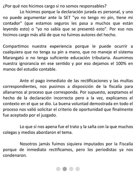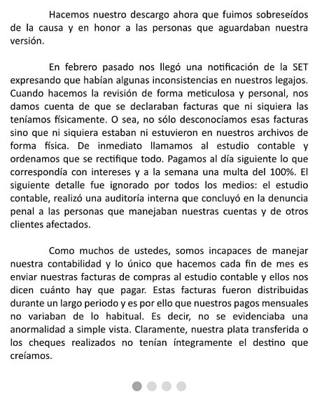 “En febrero pasado nos llegó una notificación de la SET expresando que habían algunas inconsistencias en nuestros legajos. Cuando hacemos la revisión de forma meticulosa y personal, nos damos cuenta de que se declaraban facturas que ni siquiera las teníamos físicamente. O sea, no solo desconocíamos esas facturas sino que ni siquiera estaban ni estuvieron en nuestros archivos de forma física. De inmediato llamaos al estudio contable y ordenamos que se rectifique todo. Pagamos al día siguiente lo que correspondía con intereses y a la semana una multa del 100%. El siguiente detalle fue ignorado en por todos los medios: el estudio contable, realizó una auditoría interna que concluyó con la denuncia penal a las personas que manejaban nuestras cuentas y de otros clientes afectados”, señala la primera parte del extenso texto.