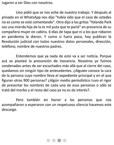 “Jugaron a ser Dios con nosotros”, afirma posteriormente, recordando algunas declaraciones de colegas. “6 días de tapa que ni a los que robaron en pandemia le dieron. Y como si fuera poco, hoy publican la Resolución judicial con todos nuestros datos personales, dirección, teléfono, nombre de nuestros padres”, expusieron.
